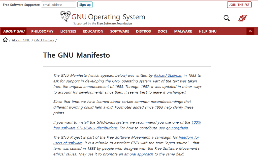 In 1983, Richard Stallman launched the GNU project. At the time, Stallman believed that users should have the freedom and control to use any software. He posted “The GNU Manifesto” on his website for “free software.” It called for the participation and cooperation of developers worldwide.