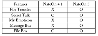 The column for version 4.1 has an “X” next to “Message Box” because it does not have that feature, whereas the column for version 5 has an “O.” The version was changed from 4.1 to 5 when features were added to NateOn. You might see the version referred to as “v4.1.” Here, “v” stands for “version.”